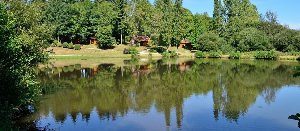 Ce parc avec ses 6 chalets en bois/pierres est situé à un endroit naturel et exceptionnel: boisé, vallonné, étangs , randonnée à pied ou VTT, jardin pour enfants, terrasse commune couverte avec BBQ.