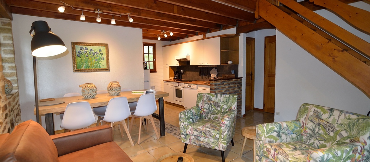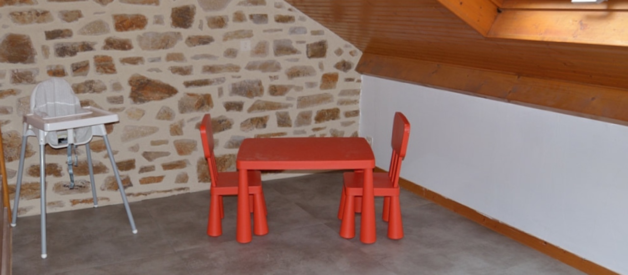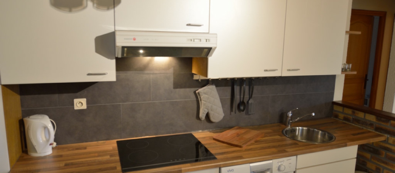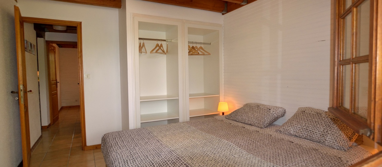 Chalet nr. 1 Les Douglas, 60 m2, 2 perspons and a baby. There is one bedroom on the ground floor, baby kot on the mezzanine. Open plan kitchen/living. This chalet has a fireplace with a glass door.
